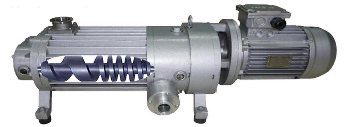 是由兩根平行的螺桿轉(zhuǎn)子與泵體內(nèi)壁形成多個密封空間,轉(zhuǎn)子與轉(zhuǎn)子之間、轉(zhuǎn)子與泵體內(nèi)壁之間均保持極小的間隙(但不接觸、無摩擦), 在反向同步齒輪驅(qū)動下,氣體持續(xù)由進(jìn)氣口向排氣口傳送的真空泵。由于兩根轉(zhuǎn)子 和泵體相互之間均無摩擦,故無需潤滑,可保持泵腔及排氣干凈。螺桿真空泵中,氣體被持續(xù)推進(jìn),通道短,效率高;排氣口低于螺桿位置,排液能力超強(qiáng),易清洗; 無中間隔板(爪式真空泵和多級羅茨真空泵有),維修保養(yǎng)簡單。